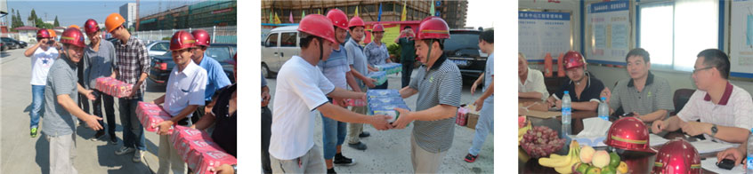 ———區(qū)建管處慰問(wèn)我公司項(xiàng)目部 年年有高溫,今年高溫特別長(zhǎng)。40℃以上的高溫連續(xù)的出現(xiàn),氣溫歷史新高的不斷突破,使得建筑工地上的民工兄弟們無(wú)法正常開(kāi)展工作。我公司根據(jù)上級(jí)主管部門(mén)的相關(guān)文件精神,及時(shí)調(diào)整作息時(shí)間以及要求項(xiàng)目部配備防暑降溫藥品并發(fā)放到各班組成員。 2013年8月9日上午,鄞州區(qū)建管處的項(xiàng)主任、鐘主任帶領(lǐng)相關(guān)人員,帶著慰問(wèn)品,冒著高溫酷暑,趕赴我公司承建的鄞州區(qū)下應(yīng)商務(wù)中心及首南街道九曲二期項(xiàng)目部,慰問(wèn)高溫時(shí)節(jié)還奮戰(zhàn)在施工一線的工作人員,向工人們送上了清涼飲料及避暑用品,并向工地全體管理、施工人員表達(dá)了誠(chéng)摯的問(wèn)候和敬意。慰問(wèn)結(jié)束之后,他們還分別檢查了食堂、餐廳衛(wèi)生情況、工人宿舍條件,要求我們公司及項(xiàng)目部一定要做好工地防暑降溫的具體工作,要落實(shí)專(zhuān)人進(jìn)行管理,強(qiáng)調(diào)高溫季節(jié)作業(yè)時(shí)間必須按照文件精神,調(diào)整工序,減少露天作業(yè)時(shí)間,做好防暑降溫工作和飲食衛(wèi)生工作,防止因高溫天氣引發(fā)工人中暑、食物中毒和各類(lèi)生產(chǎn)安全事故,切實(shí)保障一線施工人員的安全和健康。