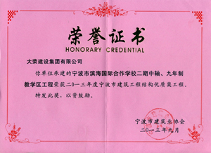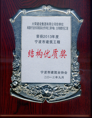 寧波市濱海國際合作學(xué)校二期中軸、九年制教學(xué)區(qū)工程是繼去年寧波市鄞州區(qū)銀行保險辦公大樓工程后我公司獲得的第二個“寧波市結(jié)構(gòu)優(yōu)質(zhì)獎”工程。 “寧波市建筑結(jié)構(gòu)優(yōu)質(zhì)獎”是寧波市建筑工程結(jié)構(gòu)質(zhì)量的最高榮譽(yù)獎,也是參評“寧波市甬江建設(shè)杯”錢江杯“的先決條件。此次的獲獎,也為該工程申報2013年寧波市甬江建設(shè)杯奠定了基礎(chǔ),更為來年申報“錢江杯”開了個好頭! 下圖為結(jié)構(gòu)優(yōu)質(zhì)獎獲獎證書。