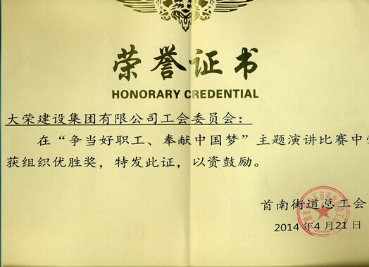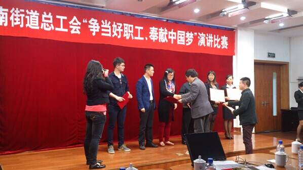 2014年4月21日,我公司員工張柳雅、陳旻龍、吳曉云代表公司參加由首南街道總工會組織的“爭當好職工、奉獻中國夢”主題演講比賽,并取得了一個三等獎,兩個優勝獎的好成績,同時大榮建設集團有限公司還被街道總工會評為“爭當好職工、奉獻中國夢”主題演講比賽組織優勝獎的榮譽稱號。
