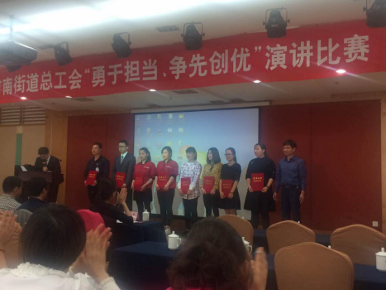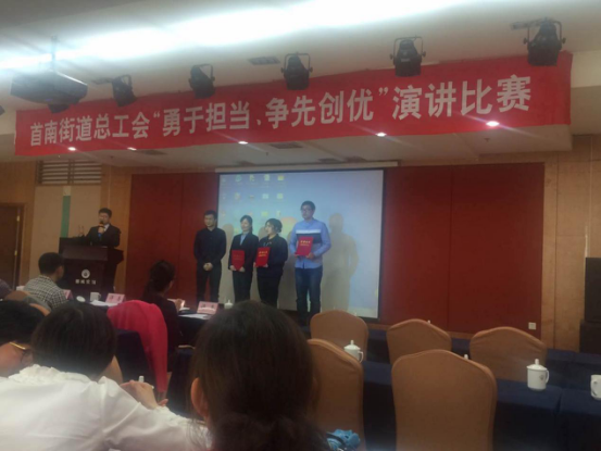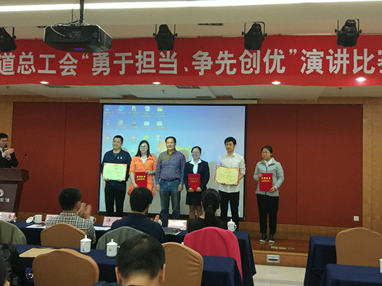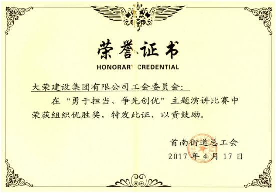 2017年4月17日下午,為進(jìn)一步培育和踐行社會主義核心價值觀,全面提高職工道德素養(yǎng),大力弘揚(yáng)“勇于擔(dān)當(dāng),爭先創(chuàng)優(yōu)”的勞動精神,首南街道總工會舉辦主題為“勇于擔(dān)當(dāng),爭先創(chuàng)優(yōu)”職工演講比賽。大榮公司員工毛晨、張柳雅和費(fèi)陳三位同志參加了該比賽,其中毛晨榮獲三等獎、張柳雅和費(fèi)陳榮獲優(yōu)勝獎,同時大榮建設(shè)集團(tuán)有限公司榮獲組織優(yōu)勝獎。