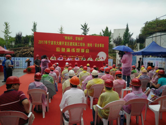 2017年6月28日上午, 寧波大榭開(kāi)發(fā)規(guī)劃局在我公司承建的大榭醫(yī)院改擴(kuò)建工程項(xiàng)目部,舉行“樹標(biāo)桿、學(xué)標(biāo)桿”2017年寧波市大榭開(kāi)發(fā)區(qū)建筑施工現(xiàn)場(chǎng)(觸電)安全施工應(yīng)急演練觀摩會(huì),社會(huì)保障局、安全環(huán)保局、應(yīng)急辦相關(guān)負(fù)責(zé)人和全區(qū)在建工程的建設(shè)、監(jiān)理、施工單位相關(guān)人員近60人參加演練觀摩。