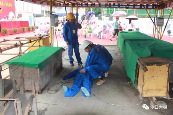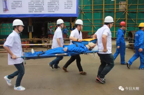 本次演練假設(shè)以大榮建設(shè)集團(tuán)有限公司承建的大榭醫(yī)院改擴(kuò)建工程發(fā)生一起1人觸電事故為背景。事故發(fā)生后,項(xiàng)目部立即啟動(dòng)應(yīng)急救援方案,切斷電源,開(kāi)展自救,并組織施工人員撤離。同時(shí),救護(hù)人員現(xiàn)場(chǎng)施救,及時(shí)將觸電人員送往醫(yī)院。